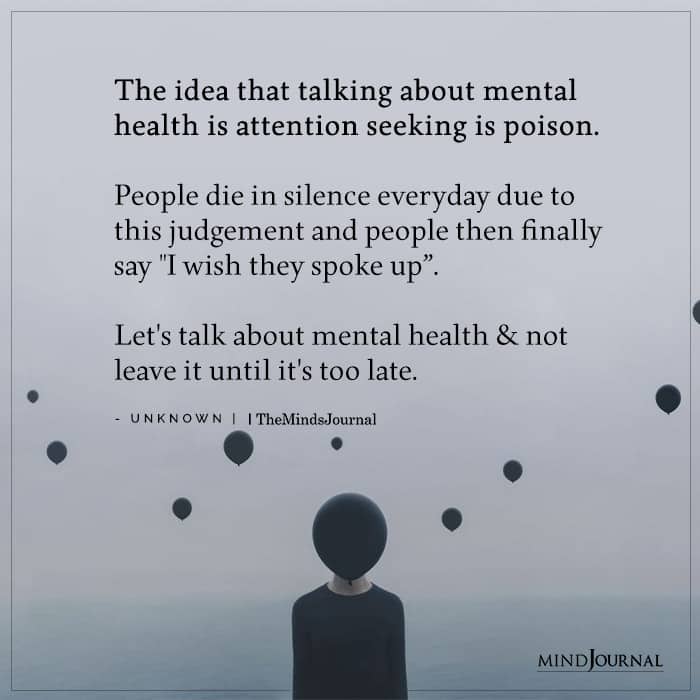The idea that talking about mental health is attention seeking is poison. People die in silence everyday due to this judgment and people then finally say “I wish they spoke up”. Let’s talk about mental health & not leave it until it’s too late.