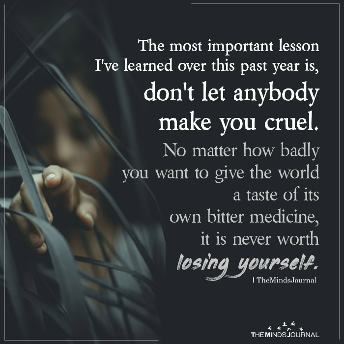 The most important lesson I’ve learned over this past year is, don’t let anybody make you cruel. No matter how badly you want to give the world a taste of its own bitter medicine, it is never worth losing yourself.