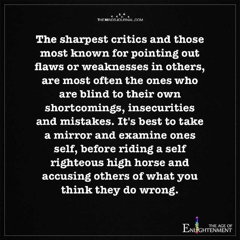 The sharpest critics and those most known for pointing out flaws or weaknesses in others are most often the ones who are blind to their own shortcomings, insecurities, and mistakes. It’s best to take a mirror and examine oneself, before riding a self-righteous high horse and accusing others of what you think they do wrong.