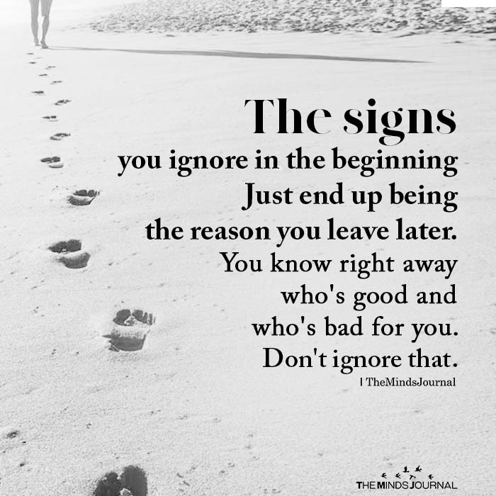 The signs you ignore in the beginning Just end up being the reason you leave later. You know right away who’s good and who’s bad for you. Don’t ignore that.