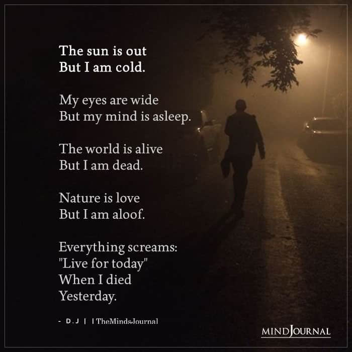 The sun is out But I am cold. My eyes are wide But my mind is asleep. The world is alive But I am dead. Nature is love But I am aloof. Everything screams: “Live for today” When I died Yesterday.