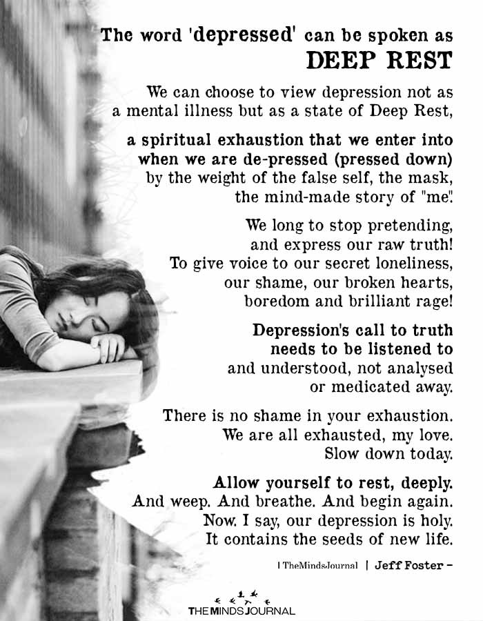 We can choose to view depression, not as a mental illness but as a state of Deep Rest, a spiritual exhaustion that we enter into when we are depressed (pressed down) by the weight of the false self, the mask, the mind-made story of “me”. We long to stop pretending, and express our raw truth! To give voice to our secret loneliness, our shame, our broken hearts, boredom, and brilliant rage! Depression’s call to truth needs to be listened to and understood, not analyzed or medicated away. There is no shame in your exhaustion. We are all exhausted, my love. Slow down today. Allow yourself to rest, deeply. And weep. And breathe. And begin again. Now. I say, our depression is holy.