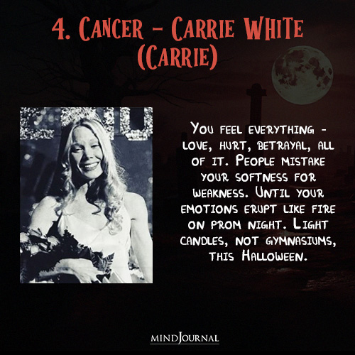 Sensitive? Intuitive? Grossly misunderstood? Cancer, you are not telekinetic (we assume), but you completely pick up Carrie’s energy. You sense everything, be it love, rejection, betrayal, on a deep soul level.