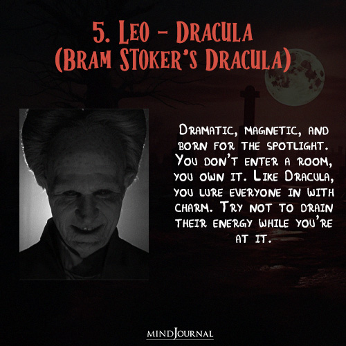 When it comes to zodiac signs as horror movie characters, gf course, the glamorous, dramatic, eternally charming Leo would be Dracula. You love attention, command the room, and thrive in the spotlight (even if itโs moonlight).