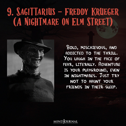 Are we talking about zodiac signs as movie characters? Well, then come on Sag – you would of course be Freddy Krueger. You are wicked, daring, and have a killer sense of humor, even when things turn deadly.