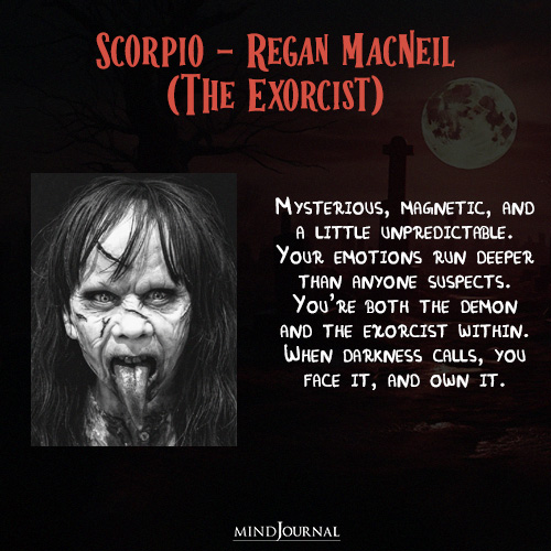 Dark, intense, and emotionally charged – Scorpio, your energy matches The Exorcistโs level of eerie transformation. You are extremely attractive, but also a little volatile when feelings get out of control.
