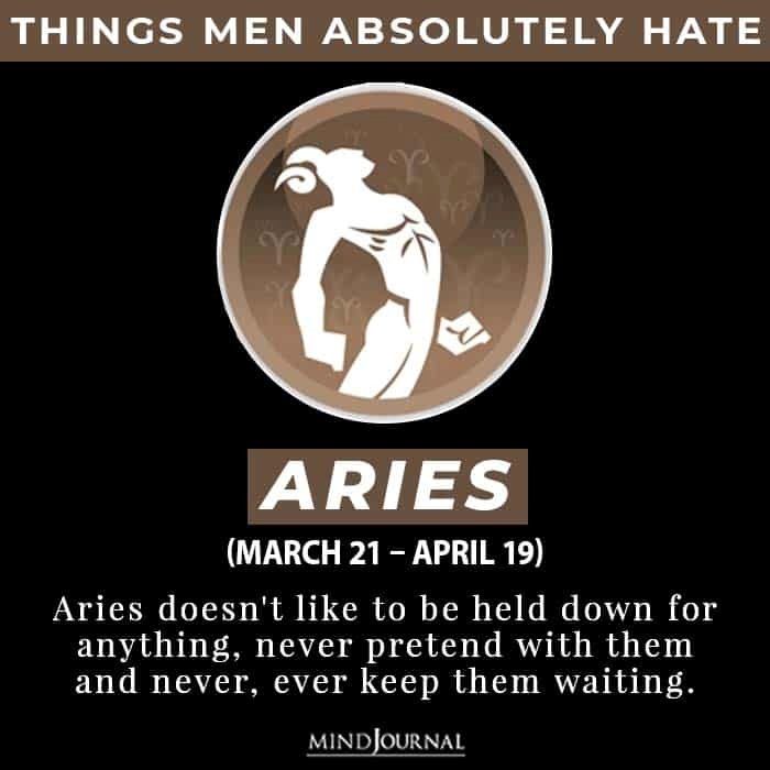 Aries doesn’t like to be held down for anything, never pretend with them and never, ever keep them waiting. This sign is known for having a quick loss of temper. Aries cannot stand people who try to hold them up. They are the most aggressive and impulsive of all signs.