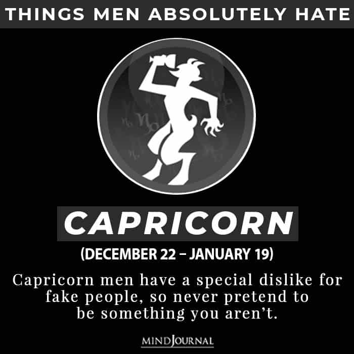 Capricorn men have a special dislike for fake people, so never pretend to be something you aren’t. They absolutely loathe careless and unproductive people. Capricorn men have a special dislike for fake people. So never pretend to be something you aren’t, in front of him.