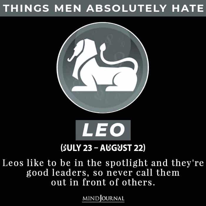 Leos like to be in the spotlight and they’re good leaders, so never call them out in front of others. In the case of a Leo man, it becomes a matter of ego. He might not openly say it but he hates when someone surpasses him and steals his share of attention.