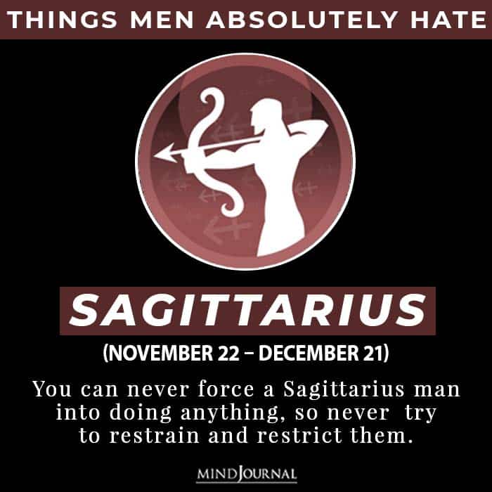 You can never force a Sagittarius man into doing anything, so never try to restrain and restrict them If he wants to be out with boys, then just let him. You can never force a Sagittarius man into doing anything. You will lose him completely if you try to knot him to yourself.
