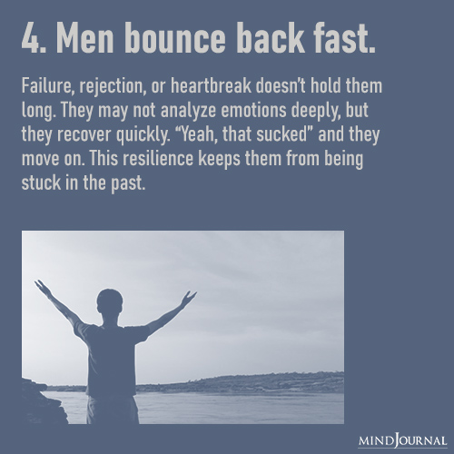 Be it failure, rejection, or even heartbreak, men may not process their emotions openly, but they sure know how to bounce back quickly. Instead of replaying every detail for weeks, men are like, “Well, that sucked,” and move on.