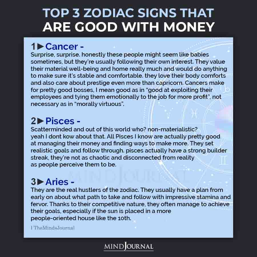 Pisces – Scatterminded and out of this world who? non-materialistic? yeah I dont kow about that. All Pisces I know are actually pretty good at managing their money and finding ways to make more. They set realistic goals and follow through. pisces actually have a strong builder streak, they’re not as chaotic and disconnected from reality as people perceive them to be.
