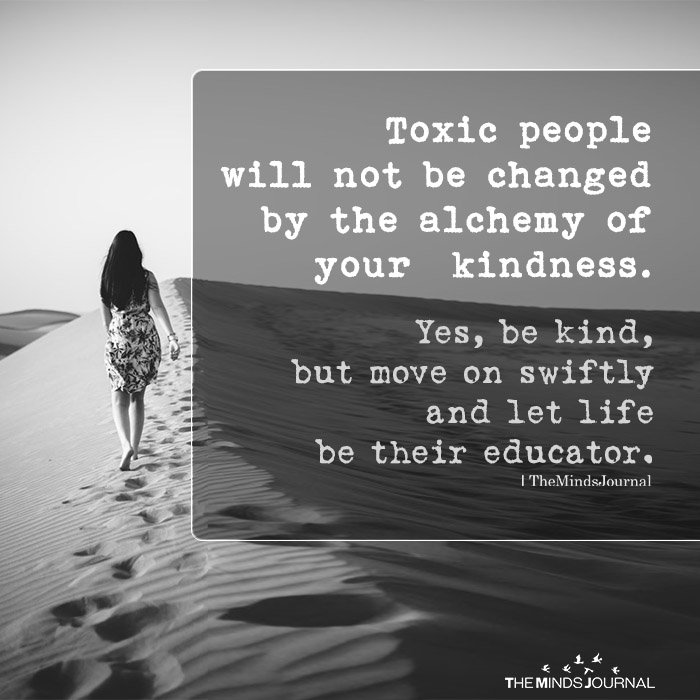 Toxic people will not be changed by the alchemy of your kindness. Yes, be kind, but move on swiftly and let life be their educator.