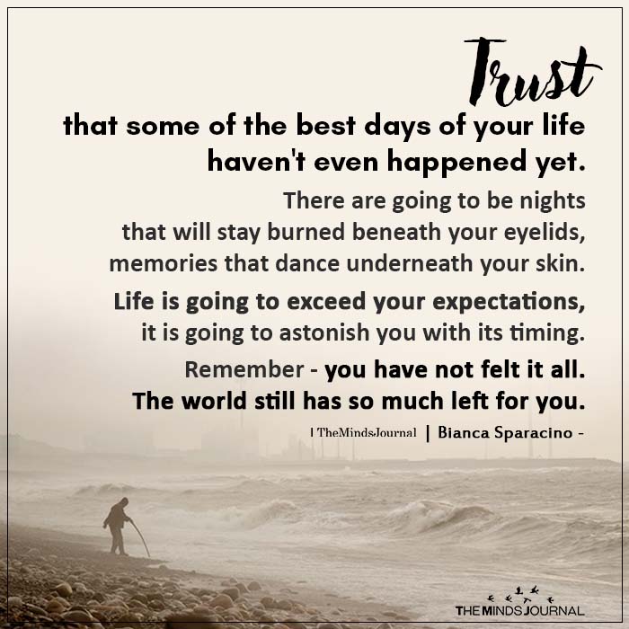 Trust that some of the best days of your life haven’t even happened yet. There are going to be nights that will stay burned beneath your eyelids, memories that dance underneath your skin. Life is going to exceed your expectations, it is going to astonish you with its timing. Remember – you have not felt it all. The world still has so much left for you.