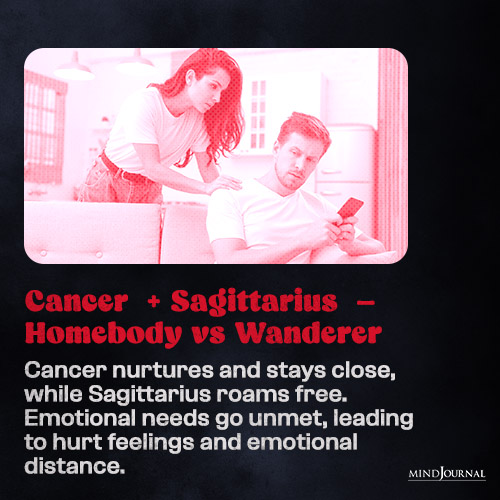 Cancer is an emotional sign and they get hurt very often. When feeling blue, they turn to their loved ones for the comfort which they themselves give away so freely. But Sagittarius is not a big fan of emotional drama and they donโt feel quite comfortable pacifying others during a meltdown. So, you can imagine how hurt and left out Cancer must feel when Sag goes on living as nothing really is wrong. If Cancer nags too much, Sag can react in a typical fiery way which will hurt Cancer beyond repair.
