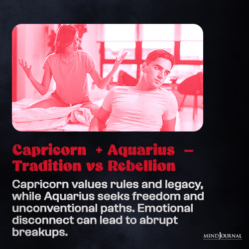 Capricorn is a conservative sign that attaches high value to traditions, rules, conventions, and family. While Aquarius is a rebel without a cause. Capricorn works hard to leave a legacy behind. Aquarius wants to end world hunger. Their principles are at odds, always.