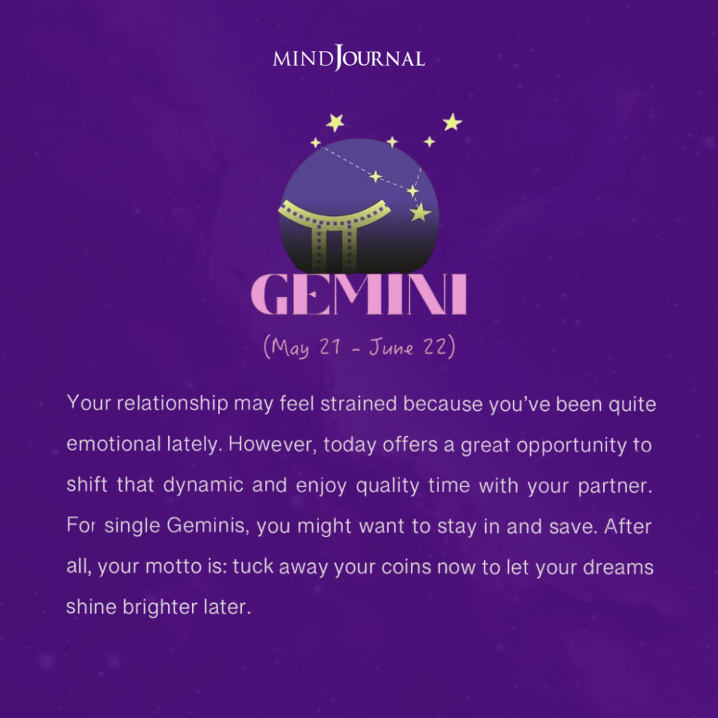 If you’re in a relationship, having meaningful conversations and spending quality time with your partner can help bring back that emotional balance you’ve been missing. For single Geminis, you might find yourself wanting a quieter, more low key day instead of anything too social or exciting. Staying in, resting, and being mindful about your spending might feel more appealing right now. Love has a calmer, more thoughtful energy for you at the moment, and that’s perfectly okay. Sometimes the best way to honor your heart is to give it the peace it needs.