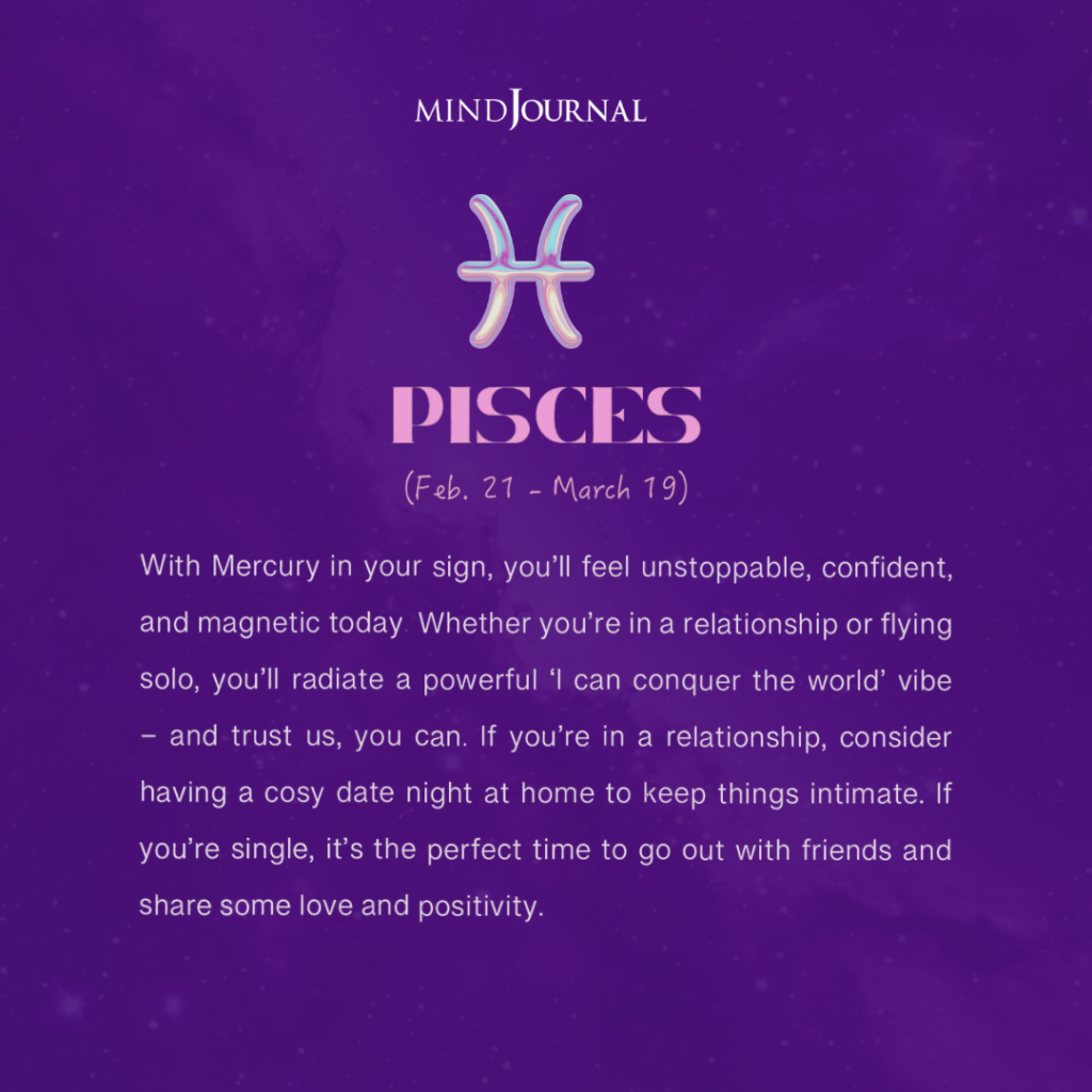 Pisces steps into Valentine’s Day feeling confident, emotionally open, and truly magnetic. Mercury is enhancing your sense of self belief right now, allowing you to radiate warmth and positive energy without even trying. People can feel that glow coming from you, and it’s beautiful.