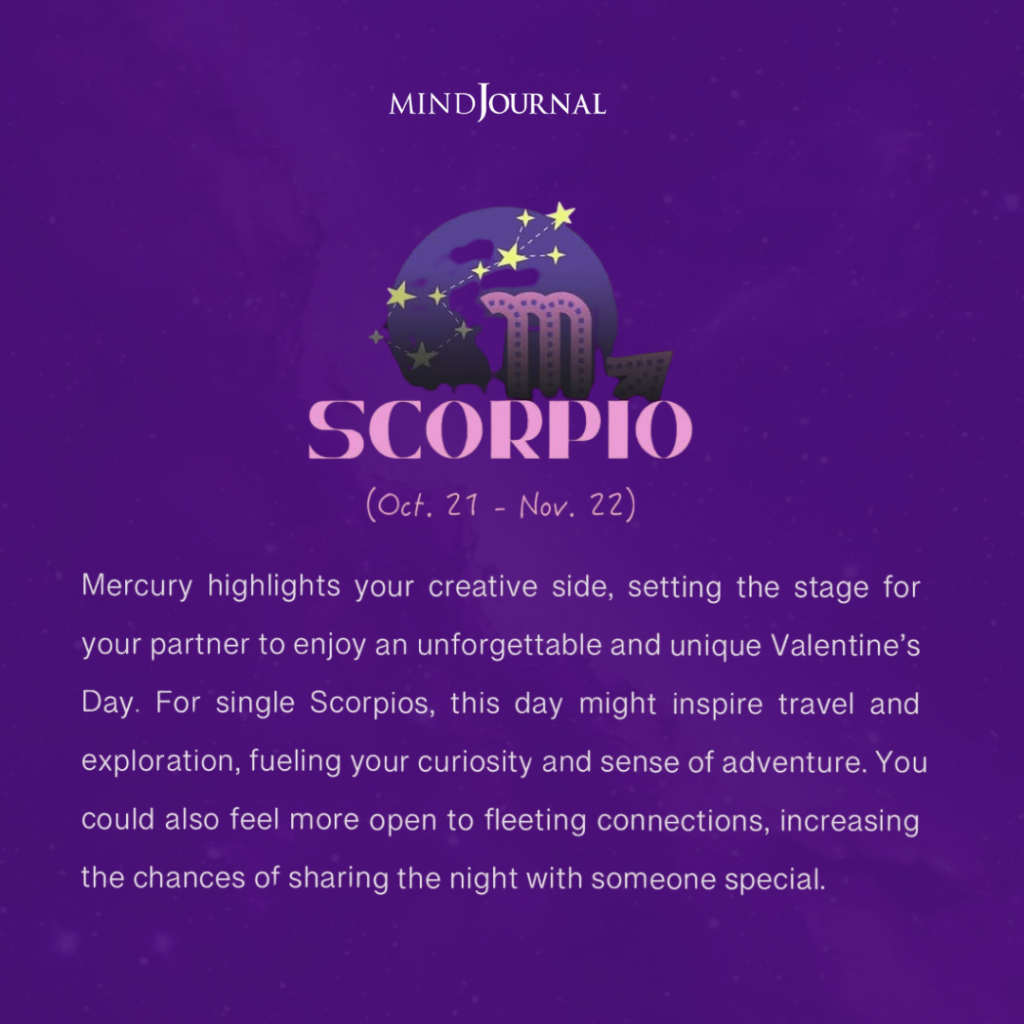 For Scorpio, Valentine’s Day is filled with creativity, curiosity, and emotional exploration this year. Mercury is highlighting your expressive side, inspiring you to find unique and interesting ways to connect with others. You’re not interested in anything typical or superficial right now. You want depth, but with a sense of freedom and discovery.