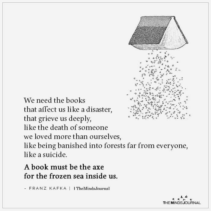 “We need the books that affect us like a disaster, that grieve us deeply, like the death of someone we loved more than ourselves, like being banished into forests far from everyone, like a suicide. A book must be the axe for the frozen sea inside us.” ― Franz Kafka