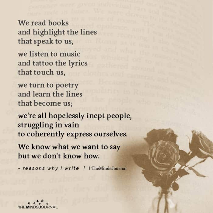 We read books and highlight the lines that speak to us, we listen to music and tattoo the lyrics that touch us, we turn to poetry and learn the lines that become us; we’re all hopelessly inept people, struggling in vain to coherently express ourselves. We know what we want to say but we don’t know how.”