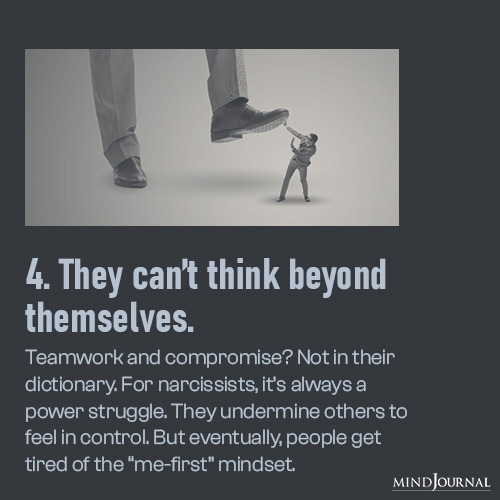 Collaboration requires compromise, understanding, and – three things that fall into the “nope” category for narcissists. That “me-first” mindset is one of their most obvious weak points.