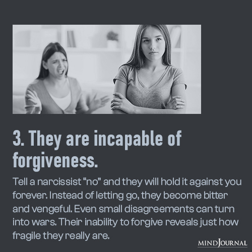 Their inability to forgive shows their fragile side; deep down, they just cannot handle criticism or rejection. This is one of the biggest weaknesses of narcissists: the fear of losing control over how people see them.
