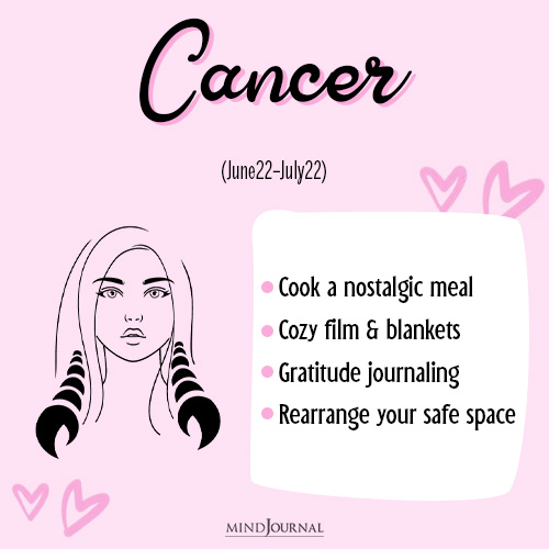 You thrive in cozy spaces, so make your home feel like a hug. Cook something from scratch (even better if itโs your comfort food), journal your thoughts, and wrap yourself in your favorite blanket. Think warm, quiet, and deeply nurturing.