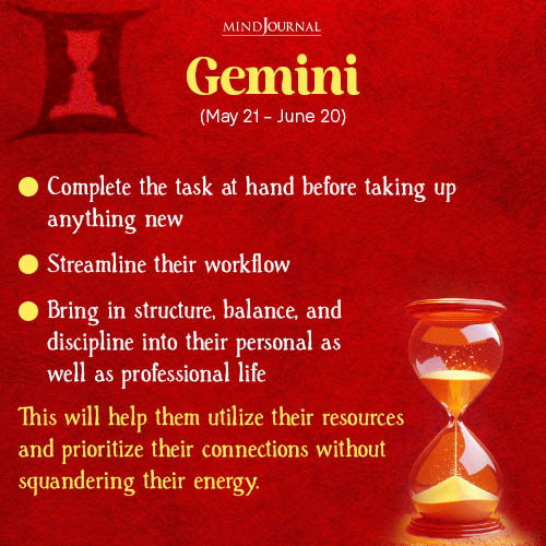This restless sign’s mental and emotional energy is often scattered. Gemini is known to juggle too many tasks and projects at one time and invest their emotions in too many people just for the sake of pushing their horizons. Working on too many ideas concurrently often leads to too many obligations.