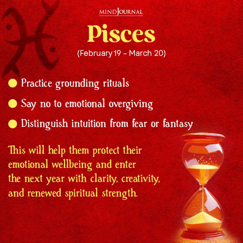 Empathic, intuitive, and dreamy, Pisces absorb the emotions of everyone around them. They often confuse their own feelings with others’ and end up emotionally drained. Their moon sign tasks for 2025 include reclaiming their energetic space and strengthening their emotional boundaries.