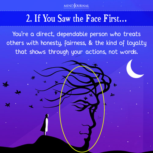 Take a moment, and look at the image carefully. Don’t overthink it. What do you see first? Is it the person standing or the large face formed by the tree branches?