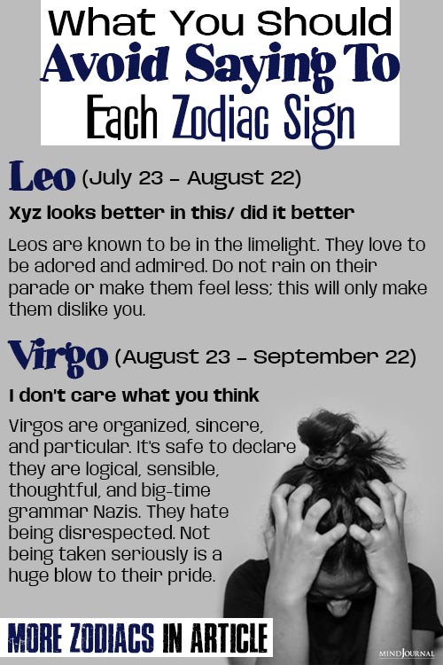 Leos are known to be in the limelight, no one can steal it from them. Members of this sign are really conscious of their looks and appearance. They love to be admired and praised. So avoid telling them things like โthat other person looks better in thisโ, โthis doesnโt suit you a lotโ. Do not be a critic in their lives, this will only make them dislike you.