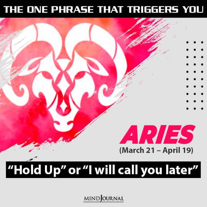 Intrusiveness, Aries cannot stand people who hold them down. They are born to focus forward. People belonging to this star sign are very restless and anxious by nature. They are impatient and hate to be kept waiting.
