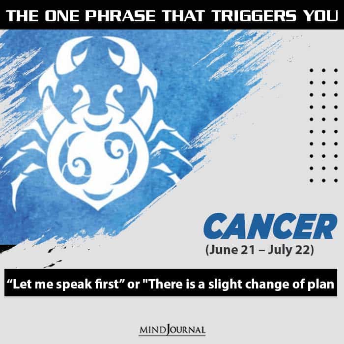 Cancerians hate being stopped or asked to delay their speeches. They find it very disrespectful if others are overtaking them. These people like their own pace, once you distract them, you may not be able to get them to talk about it with the same enthusiasm. They also do not like their schedule to be changed, hence try never to change their timings once fixed. They get irked by unstable things and haste decisions.
