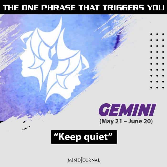 Gemini is the sign of communication and they know what they are talking about. This is why statements like โplease shut upโ or โcanโt you keep quiet?โ really hurt their ego and make them angry.