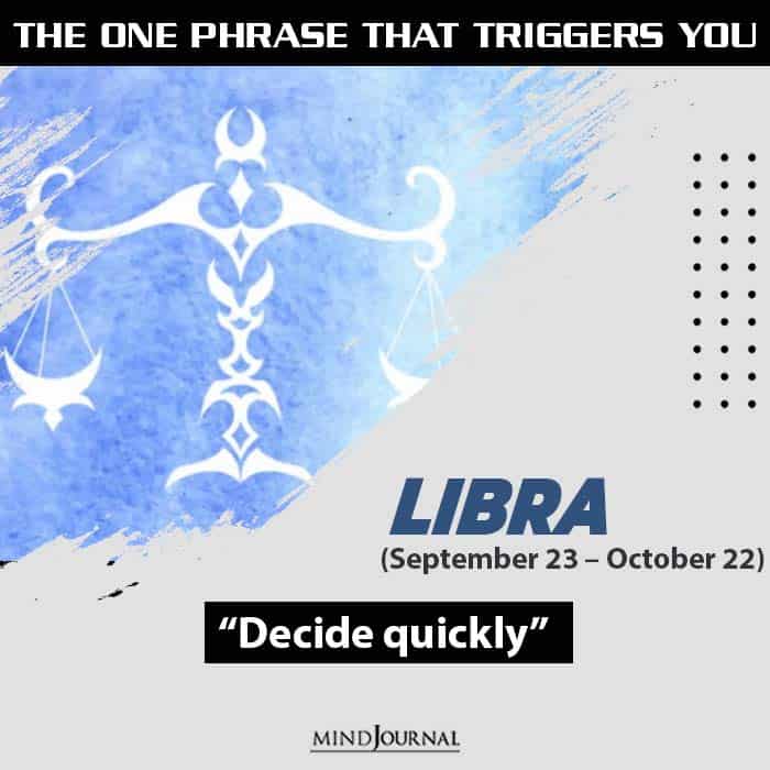 Everyone knows that Libras hate being rushed as much as they dislike being made to pick a side. Statements like โdecide quicklyโ, โyou have to choose one of usโ, or โmake your decision. I want to know right nowโ puts them under immense pressure.