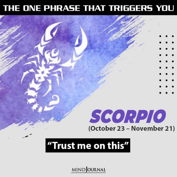 Scorpians are known for their trust issues. The phrase that triggers the most is โTrust meโ. It creates more doubts in their mind as they usually donโt like to be followed. They pretty much like to know the truth by themselves and want their partner to prove their loyalty to them rather than asking for their trust out of nowhere.
