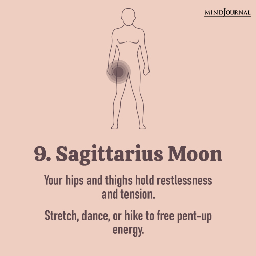 9. Sagittarius Moon: Your hips and thighs store stress, leaving you restless or tight.