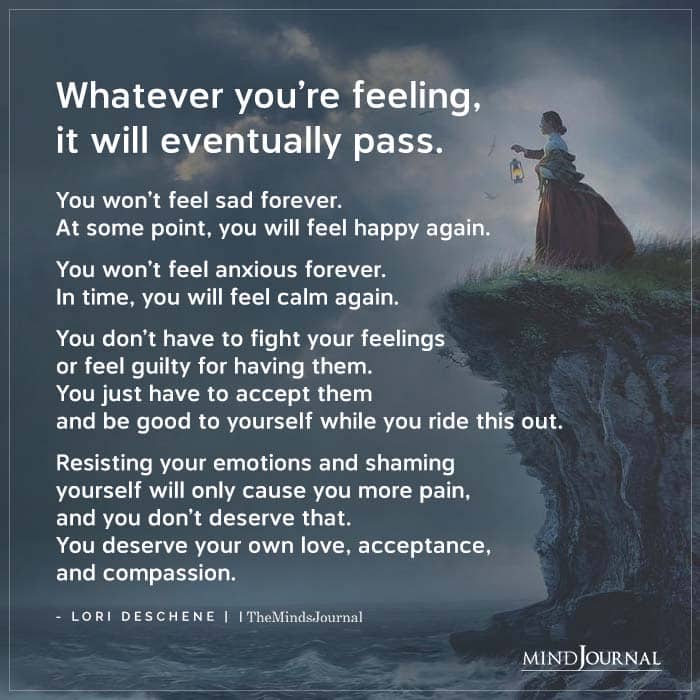 Whatever you’re feeling, it will eventually pass. You won’t feel sad forever. At some point, you will feel happy again. You won’t feel anxious forever. In time, you will feel calm again. You don’t have to fight your feelings or feel guilty for having them. You just have to accept them and be good to yourself while you ride this out. Resisting your emotions and shaming yourself will only cause you more pain, and you don’t deserve that. You deserve your own love, acceptance, and compassion.