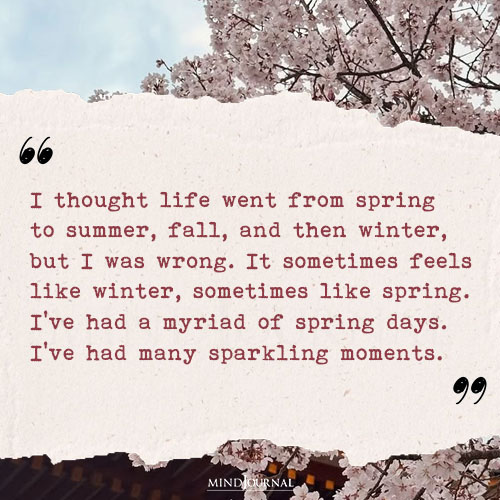 14. “I thought life went from spring to summer, fall, and then winter, but I was wrong. It sometimes feels like winter, sometimes like spring. I’ve had a myriad of spring days. I’ve had many sparkling moments.”