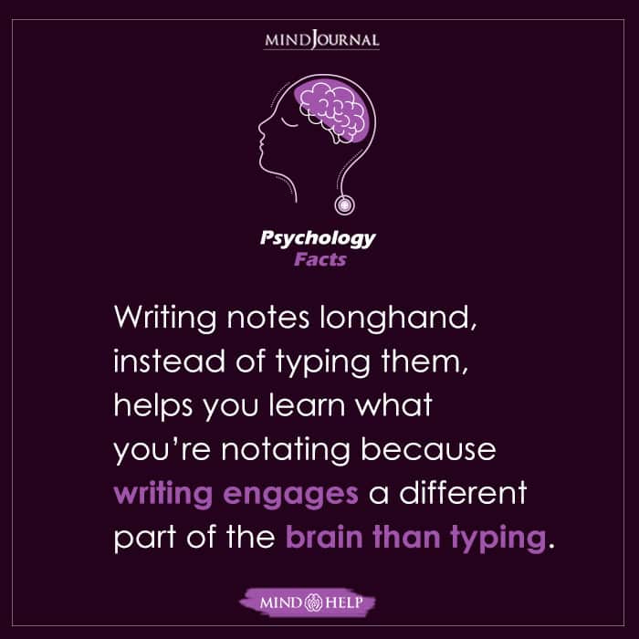 Writing notes longhand, instead of typing them, helps you learn what you’re notating because writing engages a different part of the brain than typing.