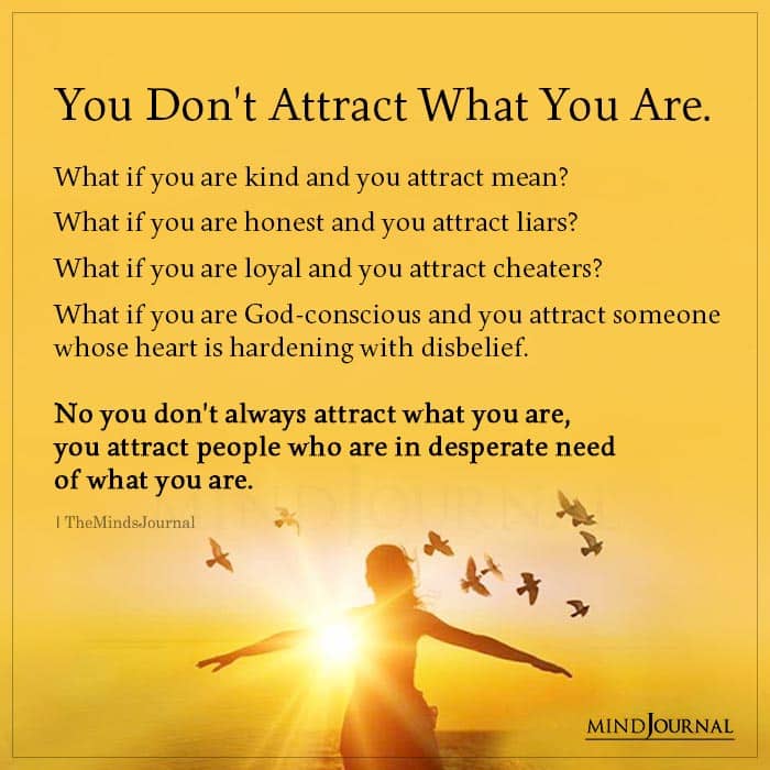 You Don’t Attract What You Are. What if you are kind and you attract mean? What if you are honest and you attract liars? What if you are loyal and you attract cheaters? What if you are God-conscious and you attract someone whose heart is hardening with disbelief. No you don’t always attract what you are, you attract people who are in desperate need of what you are.
