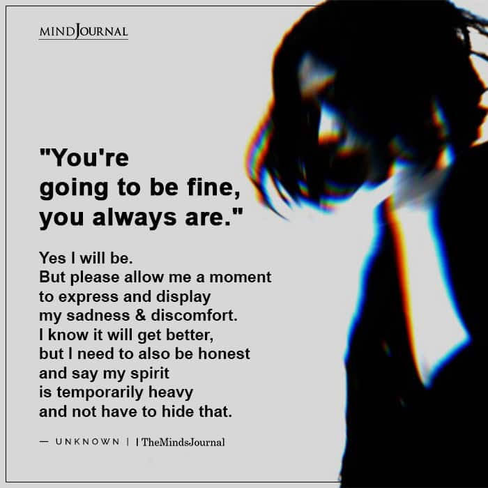 You’re going to be fine, you always are. Yes I will be. But please allow me a moment to express and display my sadness & discomfort. I know it will get better, but I need to also be honest and say my spirit is temporarily heavy and not have to hide that.