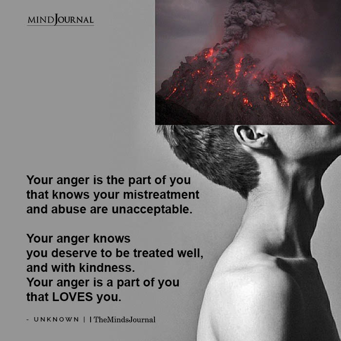 Your anger is the part of you that knows your mistreatment and abuse are unacceptable. Your anger knows you deserve to be treated well, and with kindness. Your anger is a part of you that LOVES you.