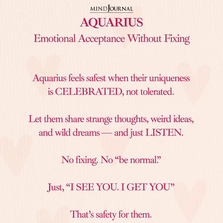 Aquarius is feeling safe in love, which means their distinct individuality is respected and valued. They are happy in relationships where their partner appreciates their rebellious notions, independence, and personal freedom. For Aquarius, love is not conforming to similarity but reveling in differences, and therefore, they require assurances that they can be themselves without judgment. When their uniqueness is embraced, they feel deeply secure and bonded, knowing that their partner admires them not merely for who they are, but for how they perceive the world differently.