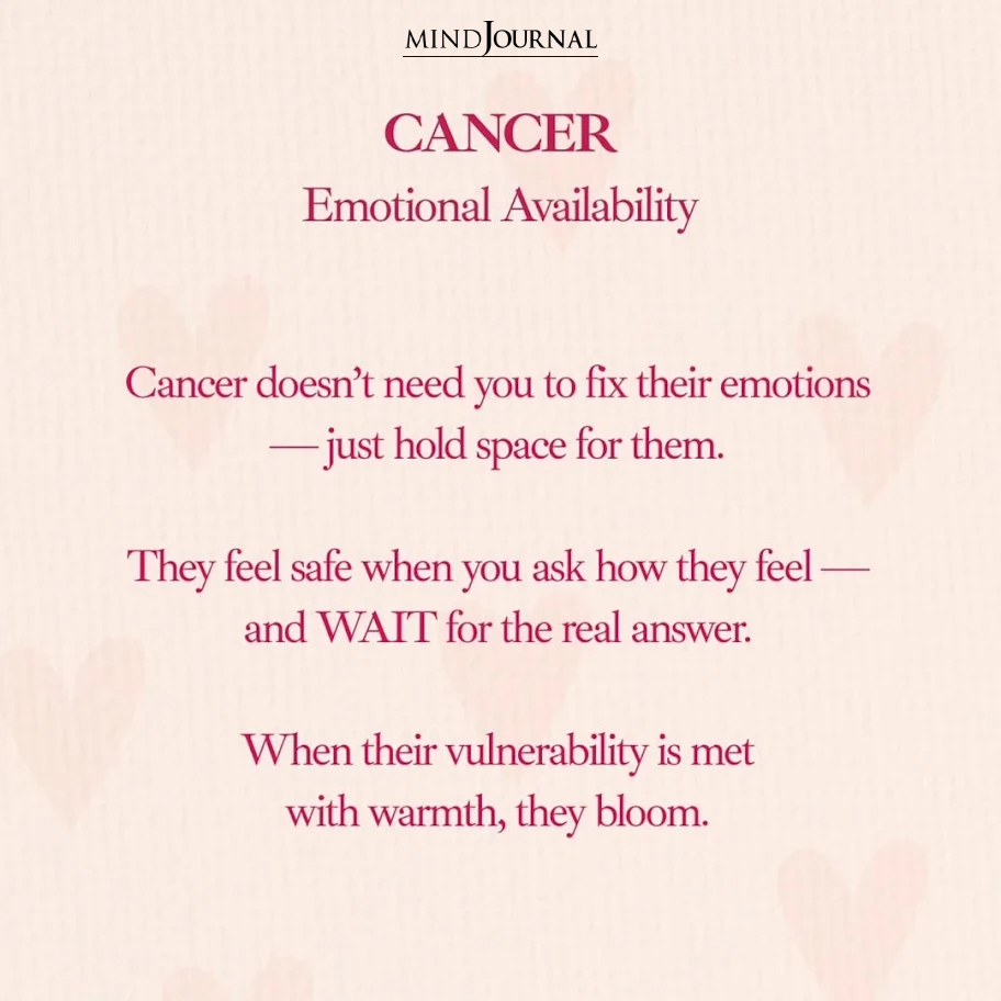 Cancer feels secure in love when their feelings are respected rather than brushed aside. They do not need fixes that are fast, but a partner who can hold their emotions. Their sensitive side will flourish when someone asks them how they actually feel and patiently waits for the response. When vulnerability is received warmly, Cancer feels that they are safe.