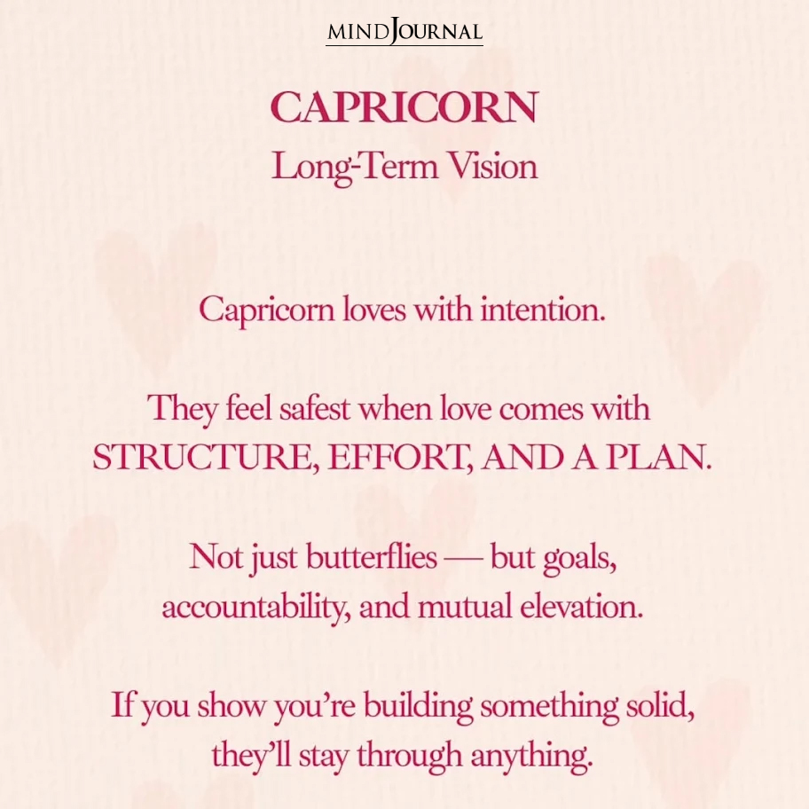 Capricorn feels safe in love when there is structure and intention. They value love that is built with effort, plans, and accountability. Their soft side blooms when they know their partner is serious about building a future together. Goals and shared visions create the foundation that makes Capricorn relax and stay through anything.
