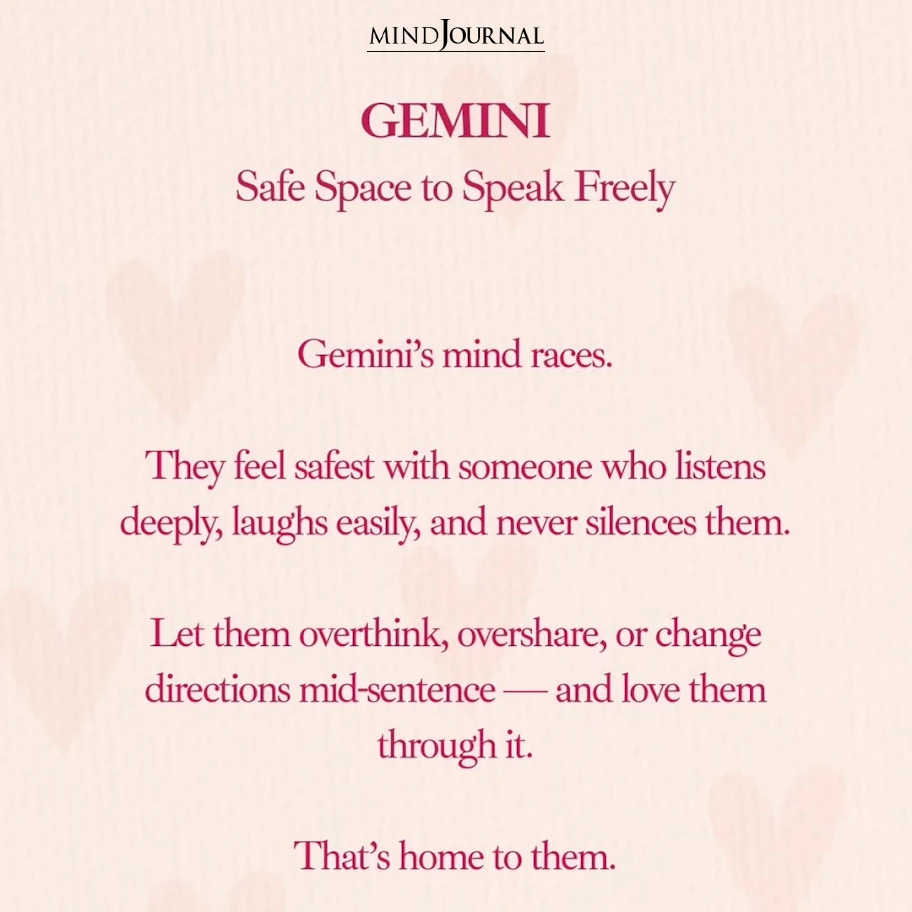 Gemini trusts in love when they are free to speak their mind without being silenced. They require a listener who accepts them with all their overthinking and sudden changes of direction. Their vulnerable side is exposed when they are permitted to laugh, to overshare, and to talk freely. Feeling safe refers to being accepted within all their flips and moods.