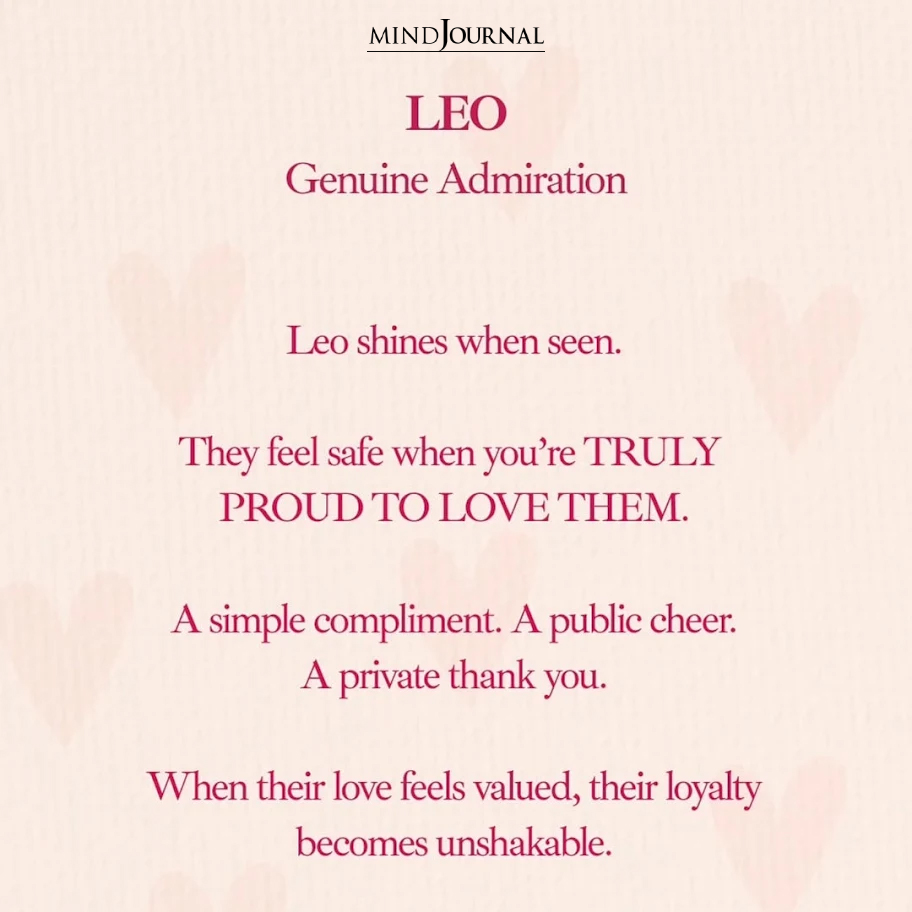 Leo feels secure in love when they are truly admired. They glow when their partner is proud of loving them, whether in compliments, public endorsement, or intimate admiration. Their vulnerable side flourishes when they see appreciation and respect for their endeavors. Once Leo is acknowledged, their devotion and loyalty become immutable.