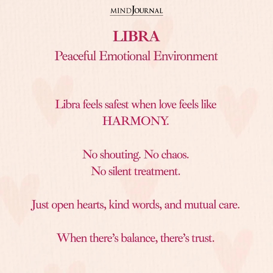 Libra is secure in love when it is harmonious. They will not survive in chaos or indifference, and they must have balance in order to trust completely. When there is softness instead of shouting or shutting down, Libra’s vulnerable side appears. With care for each other and emotional harmony, Libra is secure in love.